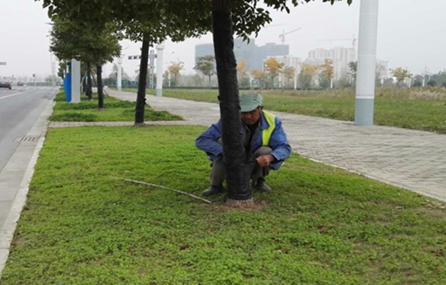 對于耐寒性差的常綠喬灌木如香樟等,進行草繩、薄膜裹樹干防凍保護處理;對于落葉喬灌木,進行樹干涂白處理,減小樹木晝夜溫差、防止樹木凍裂,并能起到殺菌、滅蟲的功效。